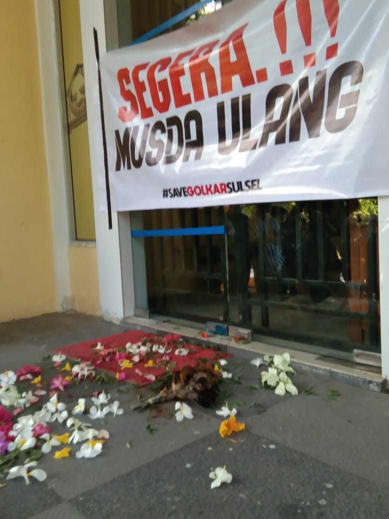 MUSDA ULANG. Koalisi Muda Partai Golkar (KMPG) Sulsel membentangkan spanduk bertuliskan ‘Segera.!!! Musda Ulang’ di pintu Sekretariat DPD I Partai Golkar Sulsel di Jl Bontolempangan, Jumat (28/8/2020). foto: istimewa