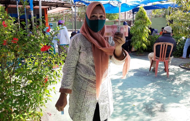 BANSOS TUNAI. Salah satu penerima bantuan sosial tunai, Nuraini, memperlihatkan uang yang diterima di Kantor Pos Pettarani, Jl AP Pettarani, Kota Makassar, Rabu (2/9/2020). foto: doelbeckz/pluz.id