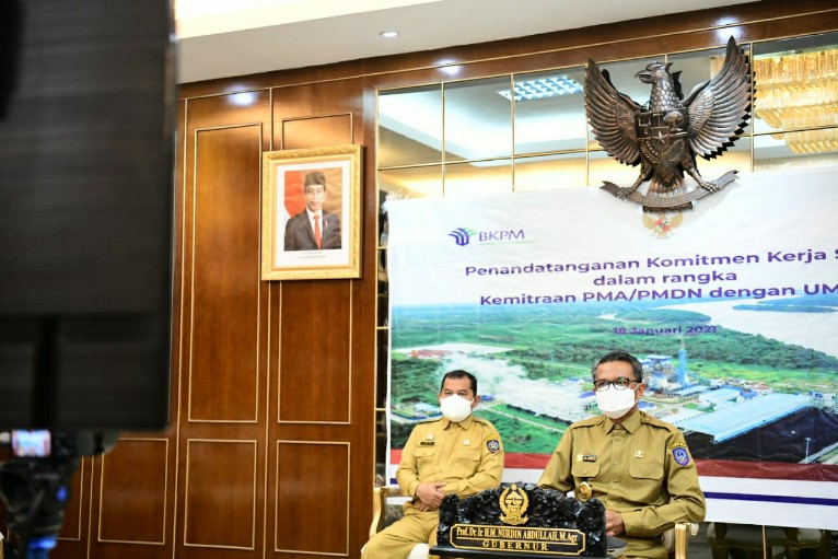 PEMBERDAYAAN UMKM. Gubernur Sulsel Nurdin Abdullah (kanan) didampingi Kepala Dinas PTSP Provinsi Sulsel Jayadi Nas saat mengikuti acara Penandatanganan Kerja Sama Dalam Rangka Kemitraan PMA dan PMDN dengan UMKM yang dibuka Presiden Joko Widodo secara virtual dari Kantor Gubernur Sulsel, Senin (18/1/2021). foto: humas pemprov sulsel