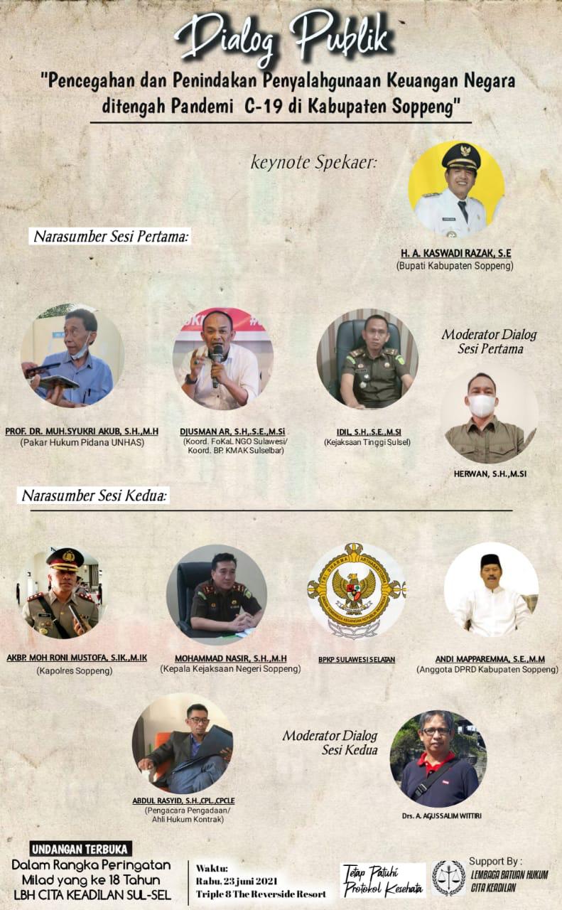 Dialog ini akan menghadirkan pembicara dari berbagai unsur, yakni Prof Dr Muh Syukri Akun SH MH (Akademisi), Djusman AR SH SE MSi (Aktivis Anti Korupsi), Idil SH MH (Kejaksaan Tinggi Sulsel), Andi Kaswadi Razak SE (Bupati Soppeng), AKBP Moh Roni Mostopa MIk (Kapolres Soppeng), Moh Nasir, SH MH (Kajari Soppeng), Andi Mapparemma M SE MM (Legislatif).