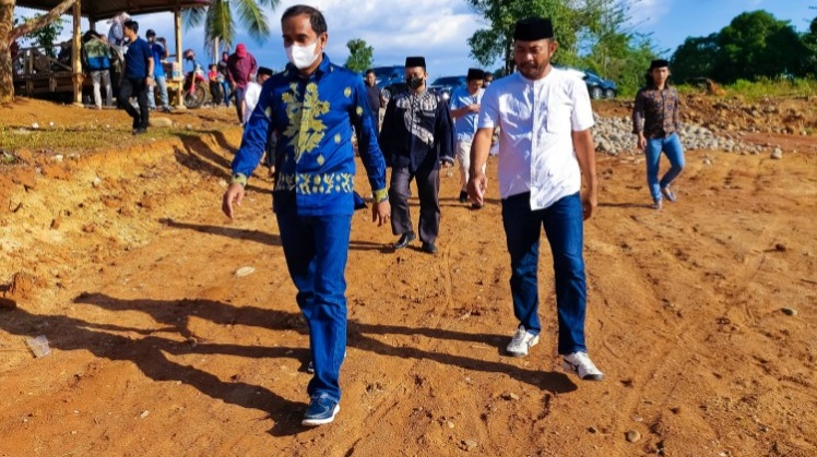 LOKASI PERUMAHAN. Pembina YARI Rudianto Lallo (kiri) didampingi Direktut PT Bonto Karannuang Abadi Jufri Pabe berjalan di lokasi pembangunan Perumahan Anak Rakyat di Gowa, Jumat (20/8/2021). foto: istimewa