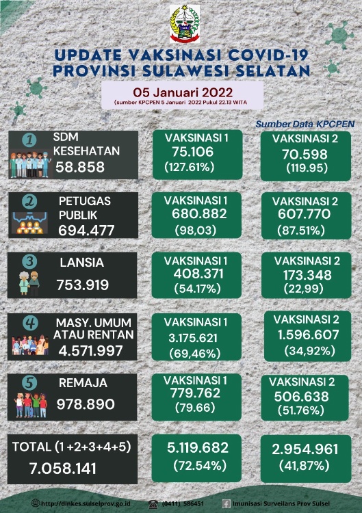Berdasarkan data KPCPEN, 5 Januari 2022 pukul 22.13 WITA, update vaksinasi Covid-19 di Sulsel untuk dosis 1 mencapai 5.119.682 orang atau 72,54 persen dari total target 7 juta lebih. Sementara untuk dosis 2 telah mencapai 2.954.961 atau 41,87 persen. Di dalamnya termasuk bagi lansia, yang telah mencapai 408.371 orang atau 54,17 persen dari total target 753.919.