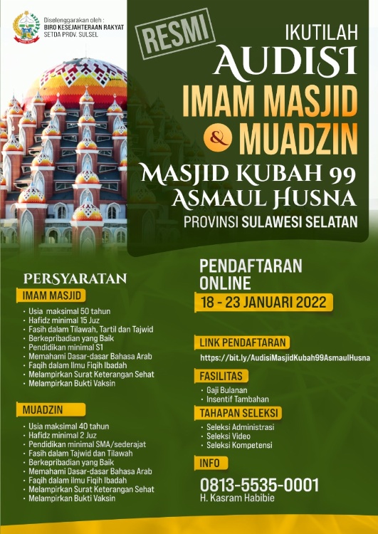 PLUZ.ID, MAKASSAR – Pemerintah Provinsi (Pemprov) Susel membuka audisi Imam Masjid dan Muazin untuk Masjid 99 Kubah Asmaul Husna Makassar yang pendaftarannya akan mulai dibuka secara online pada 18 hingga 23 Januari 2022.