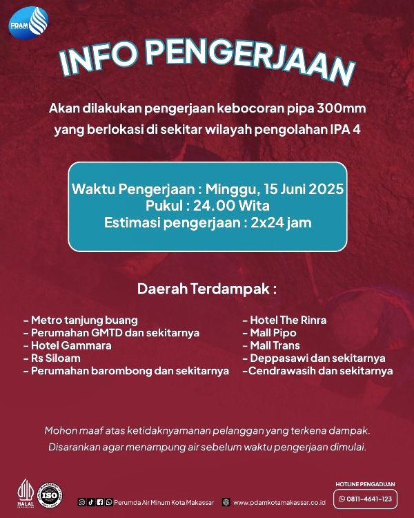 Pelaksana Tugas (Plt) Kepala Bagian Distribusi dan Kehilangan Air (DKA) PDAM Kota Makassar, Rommy Arief Derianto, mengimbau, kepada warga di wilayah terdampak untuk melakukan penampungan air secukupnya sebelum pekerjaan dimulai, guna mengantisipasi kebutuhan air selama proses berlangsung.