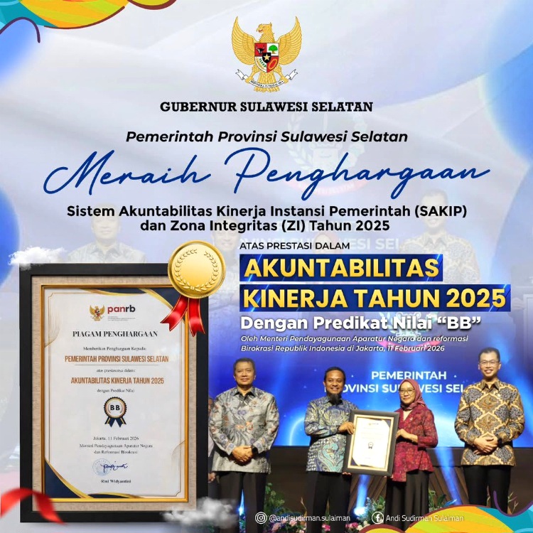 PLUZ.ID, JAKARTA – Pemerintah Provinsi (Pemprov) Sulsel menorehkan capaian di tingkat nasional di bawah kepemimpinan Gubernur Sulsel Andi Sudirman Sulaiman dan Wakil Gubernur Sulsel Fatmawati Rusdi, yakni berhasil meningkatkan nilai Sistem Akuntabilitas Kinerja Instansi Pemerintah (SAKIP) 2025 dari kategori B (Baik) menjadi BB (Sangat Baik).